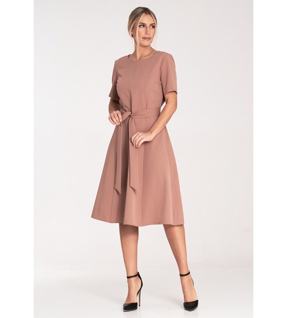 Klasyczna sukienka midi w kliny z krótkim rękawem. W pasie wiązana paskiem z materiału, zapinana z tyłu na kryty zamek, dekolt w łódkę.